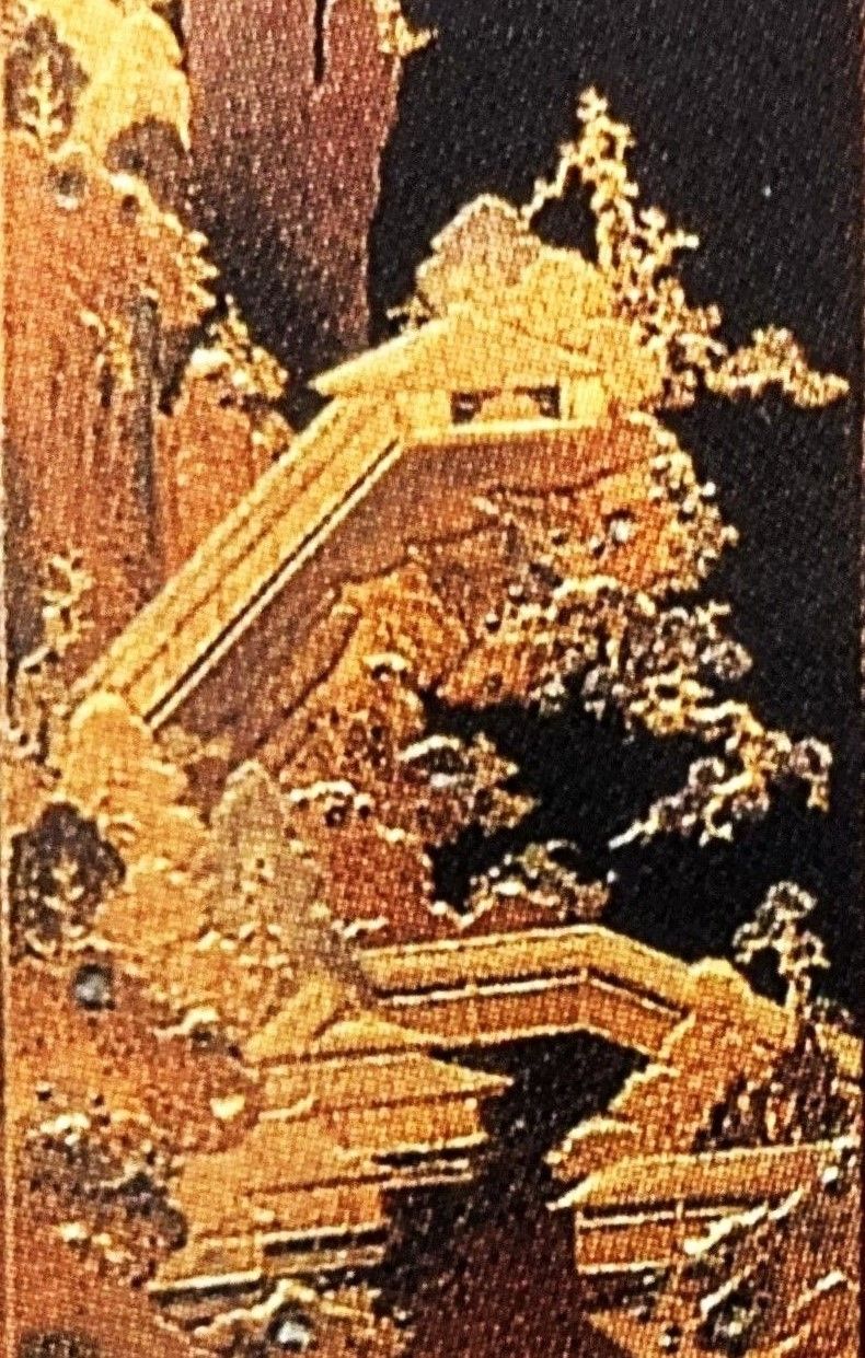 A striking equivalence of conception, from the individual structure to its relation with the environment. Note correspondences of details: how on one side there is a flight of outside stairs in the Japanese lacquer picture and the house of the queen. And in both cases, the side opposite to it is larger, the main structure. As mentioned earlier, a bridge and small detached structures are nearby in the lacquer image above, as in the Queen's House. Other Japanese lacquerware images below depict winding corridors connecting buildings and structures with different style roofs, round and square, clumped together on stilts, as in the Queen's House.