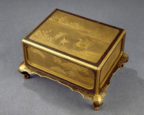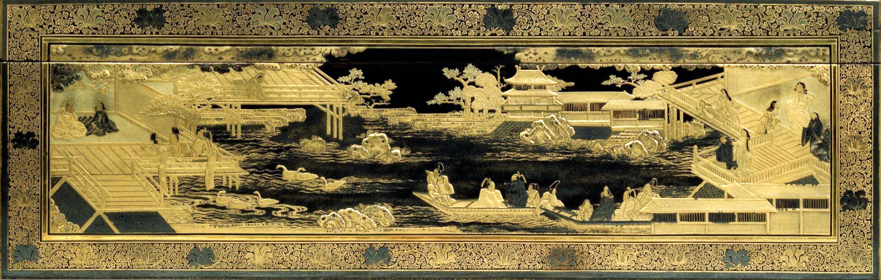 Below is the lid of the Mazarin chest now at the Rijksmuseum in Amsterdam (shown in its entirety in the previous article of this page), which the museum describes as "of matchless quality" and "one of the most luxurious specimens that 17th-century Dutch merchants brought back from Japan." The panels on all sides depict various landscapes and palace scenes from the Genji Monogatari (The Tale of Genji), a classic work of Japanese literature from the early 11th century. Minutely detailed, and decorated with high-quality urushi, makie (mother-of-pearl), silver, gold/tin foil, and powdered gold in many colours and grain sizes, it is a testimony to the virtuosity of lacquer craftsmanship attained in Japan at the time, unrivaled in both Asia and Europe.
