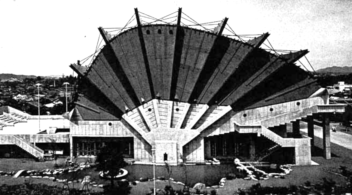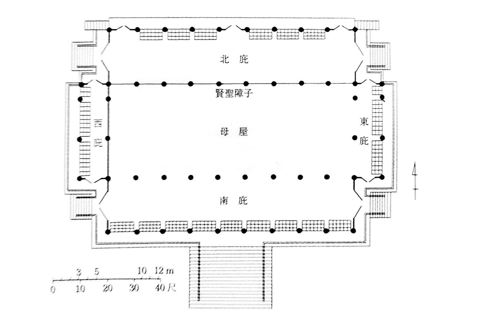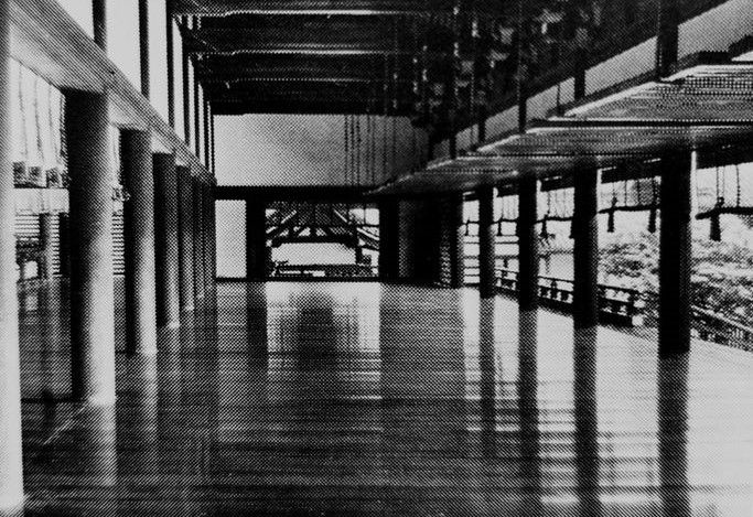 The above floor plan of Crown Hall and its facade is also reminiscent of the Kokaden, built in 1940, which is based on the Shishinden type of classical Heian architecture, but built with modern materials and technology, including glass and metal, and thus is even closer to Mies van der Rohe's structure materially and conceptually. It is interesting to note that the Kokaden was moved from Inokashira Park to Koganei Park in 1954 with some fanfare, just a few years before the building of Crown Hall. Perhaps photos in architectural journals or postcards of the event caught his eye. In any case, the trend in Japan during the early 20th century, especially during the 1920's and 1930's was the increasing use of modern materials and technology to build the kind of open, conspicuously gridded structures that characterize the works of Mies and those of his school.