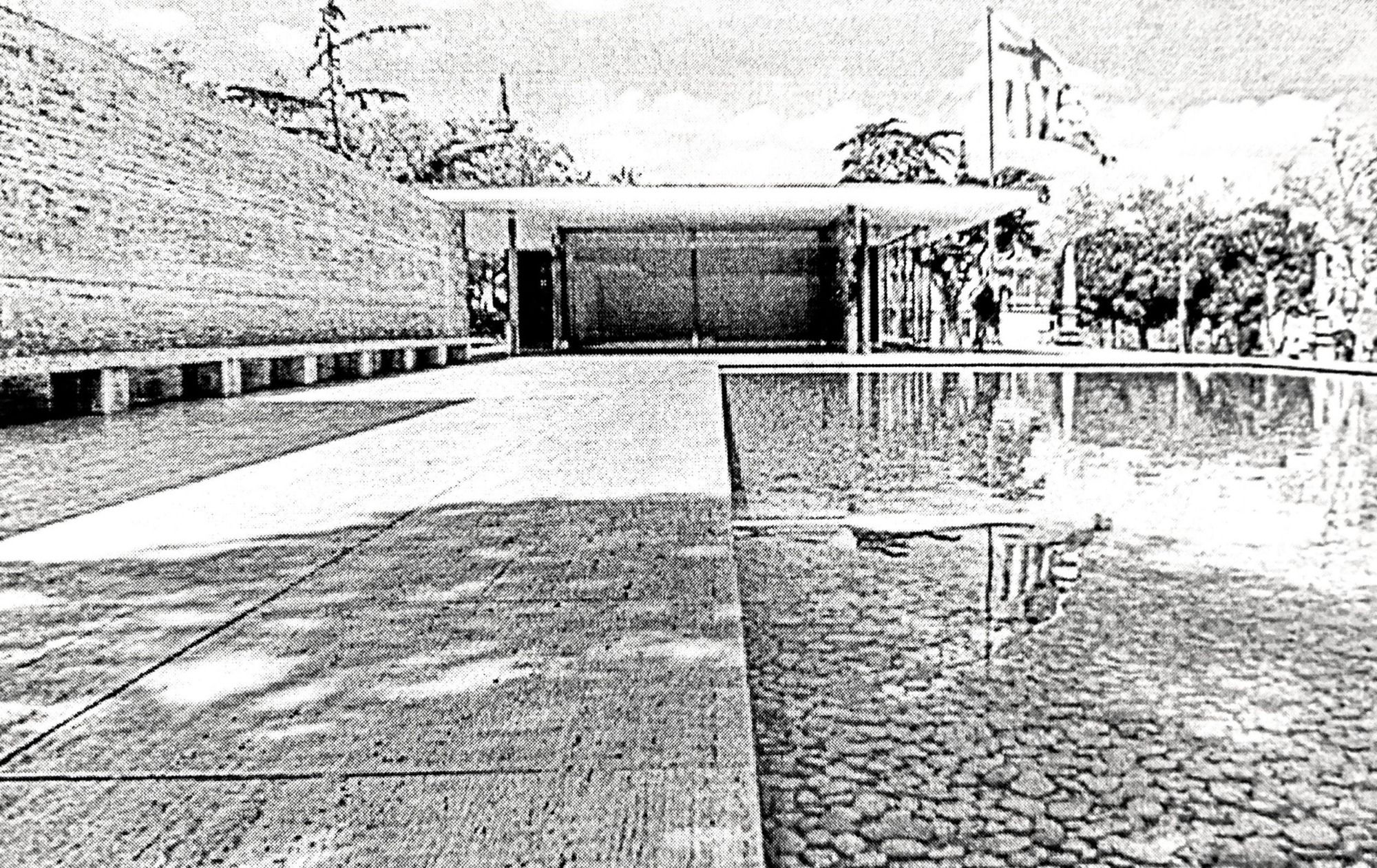 Left: level and shallow rectangular 'dry' pond, with small stones at Ryoanji Temple. Right: level and shallow 'wet' pond of similar proportions with larger stones at the Barcelona Pavilion.