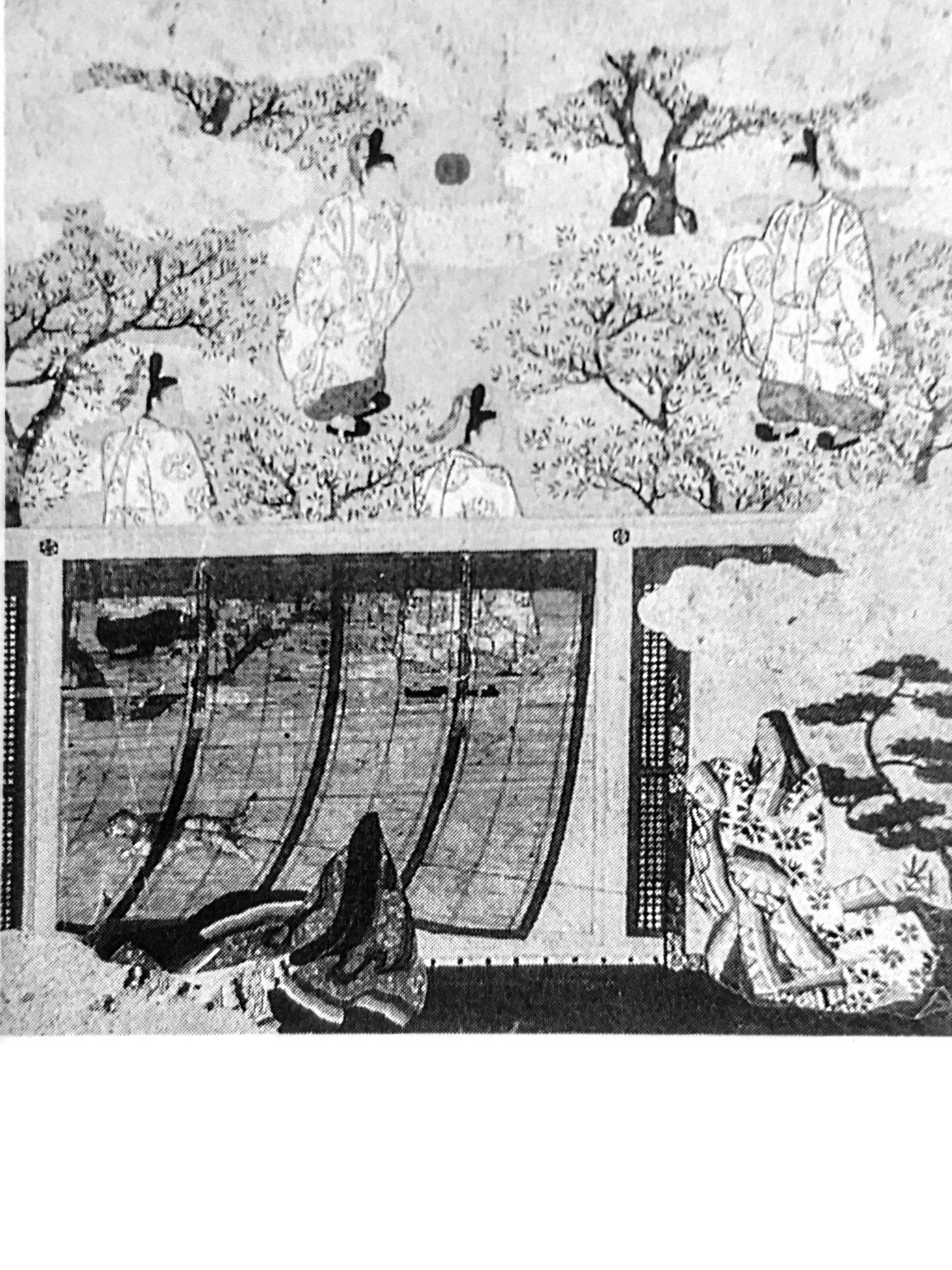 Left, Crown Hall, Illinois Institute of Technology, Chicago (1956). A photo from Siegfried Wichmann's Japonisme (1981). Right, 'Wakana-jo' one of the pictures from the Genji Monogatari Gajo (17th century, Kyoto National Museum). What better example of how Mies has tried to capture a Japanese sense of aesthetics than this---his recreation of the classic way of viewing garden sized trees, such as dwarf maples or here cherries in spring---through a fine sudare shade (and even the translucent walls of Crown Hall looking Japanesque).