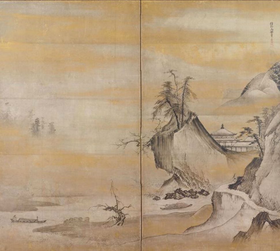 Below: Yoshino Screen, 16th century, Suntory Museum, Tokyo. A typical late Muromachi byobu screen, the sort which would influence the Rimpa School. Compare the screen with Hodler's backgrounds above. Note Hodler's expansive gold, greens, touches of grey, rocks, and scattering of white flowers, as in the Yoshino Screen.