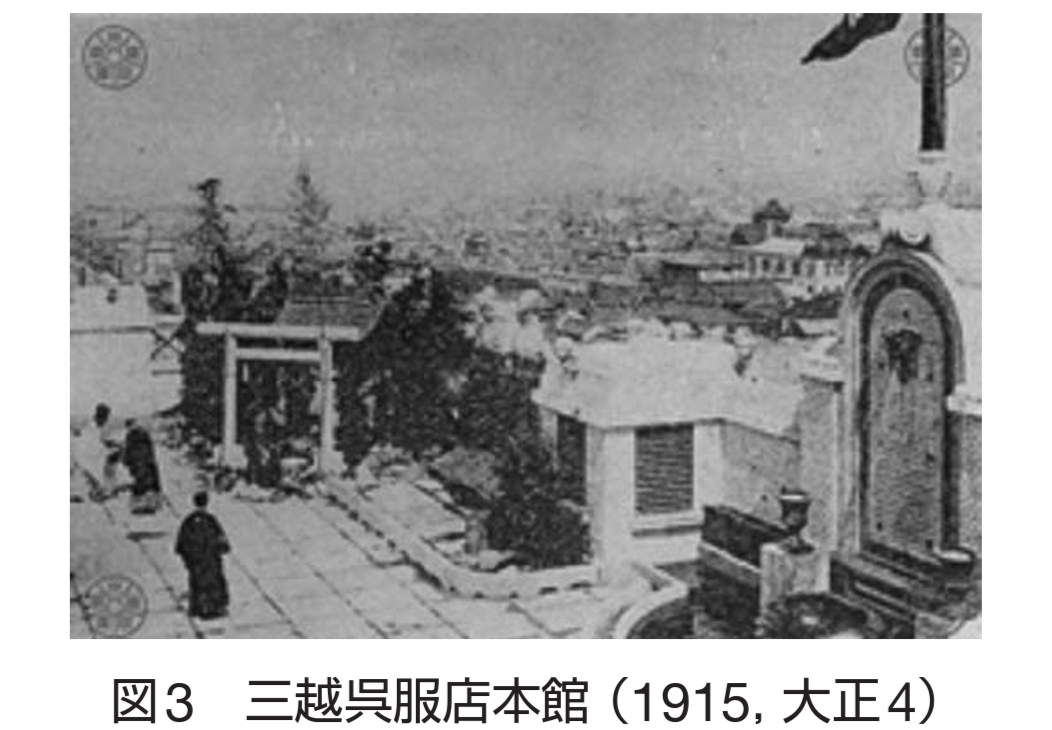 The history of rooftop gardens on modern concrete buildings, however, started in 1907, with the Oriental Hotel of Kobe (catering largely to foreigners) building a rooftop garden for its guests and the Mitsukoshi Department Store in Nihonbashi (central Tokyo) building the first 'Kuchu Teien' or Sky (or Aerial) Garden ( 空中庭園 literally mid-sky garden), which eventually had a fountain, pond, hanging wisteria racks, large numbers of bonsai and other plants, and even a small shrine (Mimeguri Inari) and tea house, covering a total area of almost 200 square meters.