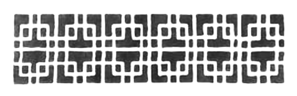 'Below: From one book such as that by Edward S. Morse, we can find many of the elements that comprise Le Corbusier's early decorative work. Note the design of bent, zigzaging lines on the right side in Le Corbusier's drawing, shown earlier. Morse's example of a Japanese window design is one indication of the various bent zigzaging type art forms, including byobu screens, that existed in Japan. One of the more common kimono motifs was the 'yagasuri' pattern of densely packed arrow feathers, a simple version of which is shown below. There are also more complex arrow feather designed textiles, and just as in Le Corbusier's drawing here, it was common to juxtapose or mix these symbols in kimono designs as in the Noh kimono shown further below.