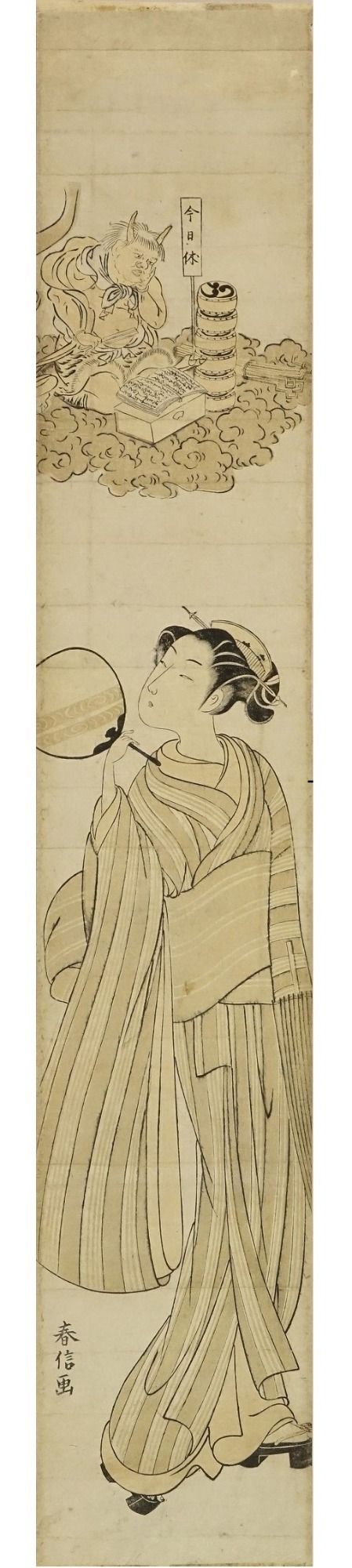 Below: Grasset's use of the vertically long 'hashira-e' (pillar picture) format in his 'Extravagance' (1897), used in Japan for hanging on square cut supporting pillars (i.e., piloti). The hashira-e was a well-established genre by the mid-18th century. Subject matter is most typically of the 'bijin-ga' (a beautiful woman picture) type, and often she holds a fan or other such object (below an example of a flower-like duster, 2nd from left by Isoda Koryusai 1735-1790?, famous for his hashira-e) to add interest to the picture, and usually there is a secondary subject of either plant, animal, or supernatural nature. Grasset has his bijin fronted with flowers that echo Koryusai's duster in form, holding a fan and a pair of spectacles. The overall color scheme may take from Koryusai picture to the left as well.