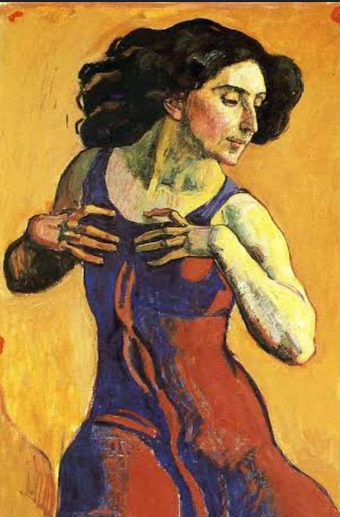 The concept of 'Back Portraiture' of single individuals as an established genre, with a reduced view, or even no view of the face. The peculiar form of dress Hodler repeatedly uses as an alternative means to express the same thing, as in his 'Joyous Woman' series (1909-1911). Therefore the hands and forehand, neck and upper back are exposed, the body and legs covered, and the hair bundled up. But how much more elegant is the Japanese kamigata (hair style) and the kimono, as vehicles of artistic expression!
