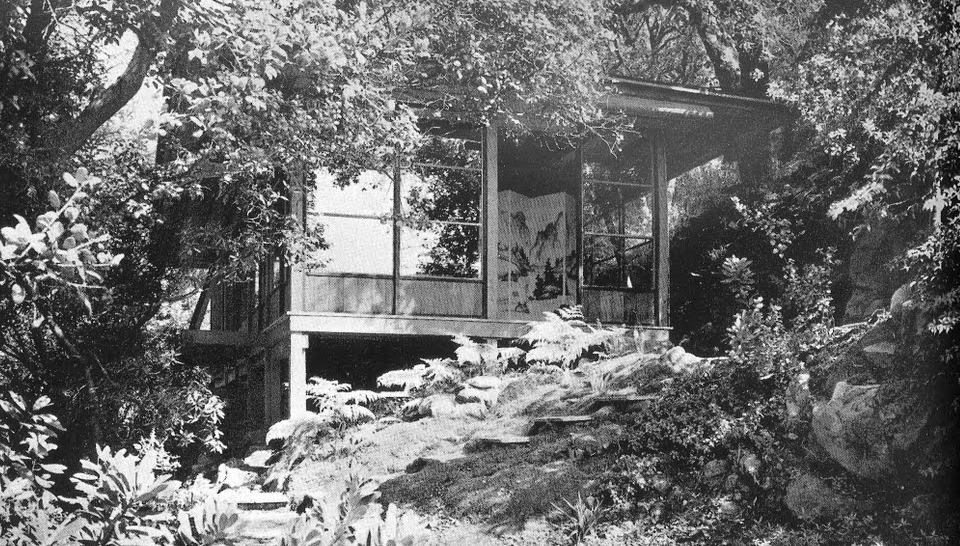 "Almost as Japanese as the homes of the Japanese themselves is the small house architect Harwell Hamilton Harris built for his own use in 1935 on a hillside in Fellowship Park, at the northeast corner of Los Angeles. ... All but the end posts are reinforced by traingular braces, a device illustrated in Morse's Japanese homes. ... The Japanese folding screen is a necessary item for providing privacy when the shoji are removed during the summer months." (Lancaster, p. 179)