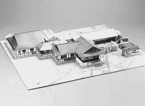 Temple and Community Center, Congregation Emanu-El, Grand Rapids, Michigan, 1948-1952 compared with Katsura Imperial Villa, Kyoto. The plan also reminds one of the Bauhaus, which is even more analogous to the Katsura Villa, and it seems Mendelsohn takes from both. While the positioning has been altered, the spatial concepts remain the same: a prominent, frontward projecting main hall, the basic bent building formations, and the square and corridor-like semi-enclosed courtyard areas; all are still clearly recognizable. Like the Katsura Villa, the main building is approached from the side, first passing along a wall.