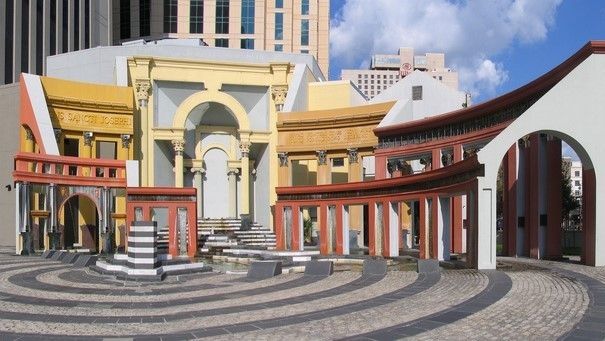 To the right is a classic of post-WWII Japanese kitsch and pastiche: Hotel Daigo, Osaka, an unrecognized masterpiece of its kind, and in danger of destruction. While Venturi claims his was a 'Learning from Las Vegas', it might be argued that certain places in Osaka, and elsewhere in Japan, were, much more than Las Vegas, strikingly 'Post-Modern' in the sense it would come to be known from the 1980's onward. Indeed, many post-modernist designs remind us more of the helter skelter of densely packed, neon-lit Japanese city backstreets of bars, restaurants, and pachinko parlors that are often thought to characterize modern Japan, with its melange of old and new, East and West, gaudy and refined, tall and short, than the facades of Los Vegas, which are relatively speaking, more orderly despite their gaudiness. Charles Moore and William Turnbull's Faculty Club in Santa Barbara (1968), for instance, which Jencks describes as an "ambiguity of spatial cues juxtaposed with traditional signs---tapestry, neon banners" and calls "typically Post-Modern" (The Language of Post-Modern Architecture, 4th edition, 1984, p. 125), is almost a streamlined stage set of such an alley in the Osaka or Tokyo of the 1960's. Its interior even seems to echo the baroque overpasses with their octopus-like multiple stairways that envelope the intersections and railway stations of Japanese cities. A more recent example might be Jon Jerde's Universal Citywalk, Universal City (1993), which might be also described as a sanitized version of Osaka's Dotonbori, in the style of its helter skelter with its large athletic figures or animals plastered to the facades of buildings with elements of them extending beyond the surface of the building.