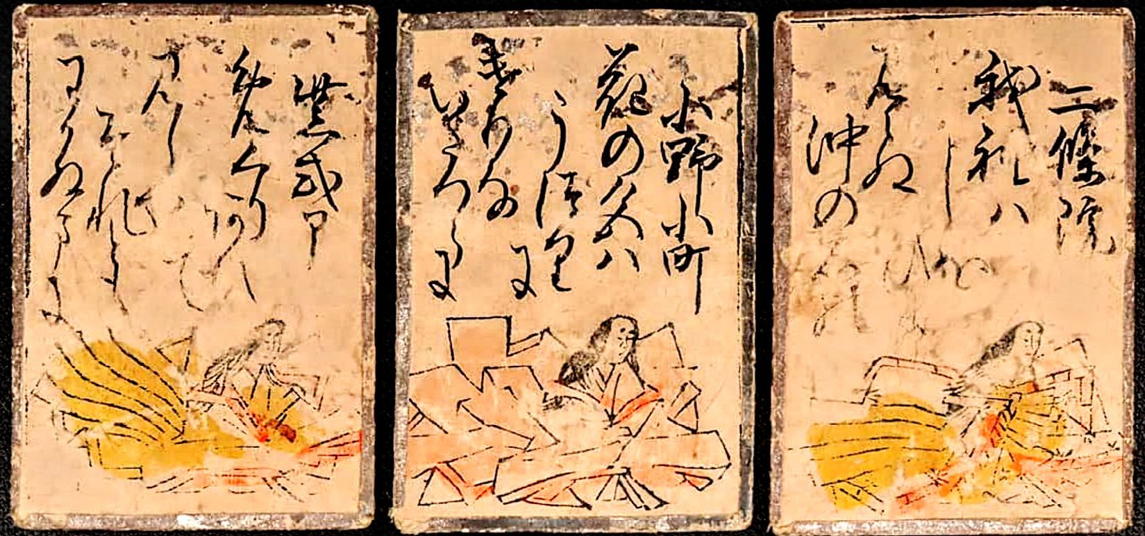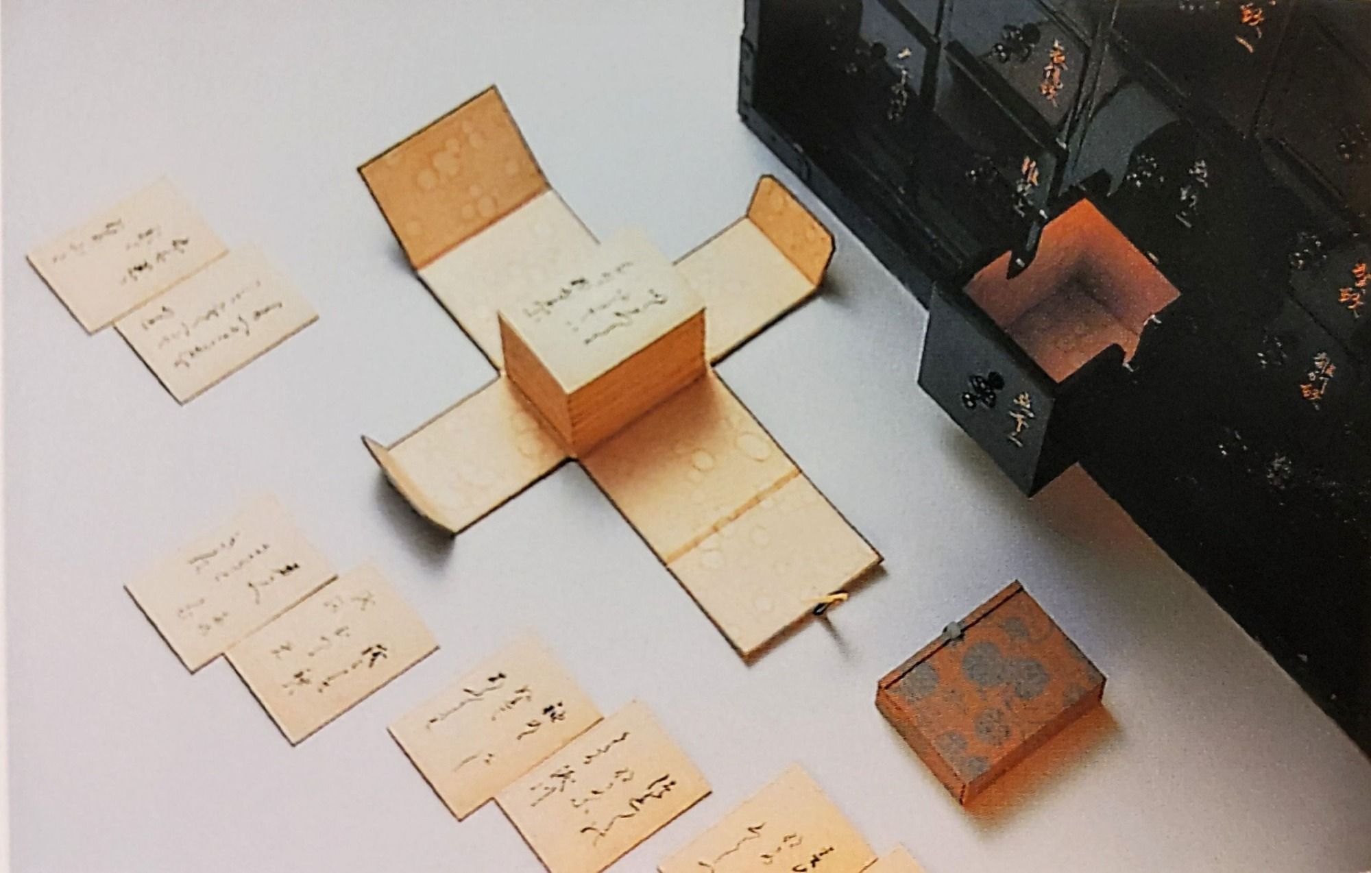 "folding screens painted on the screens themselves, which offer a fanciful catalogue of workshop styles practiced in Japan in the 1700s. They relate to two categories of decorative motifs seen on screens, one known as “Whose Sleeves?” and the other as “Scattered Fans.” Screens of the first type feature variously patterned kimono draped over lacquer racks; those in the latter category are decorated with fans that have themselves been embellished with pictures. In a nod to the “Scattered Fans” genre, one of the replica screens seen here features fans decorated with a range of motifs, from vegetables and insects to episodes from courtly narratives.