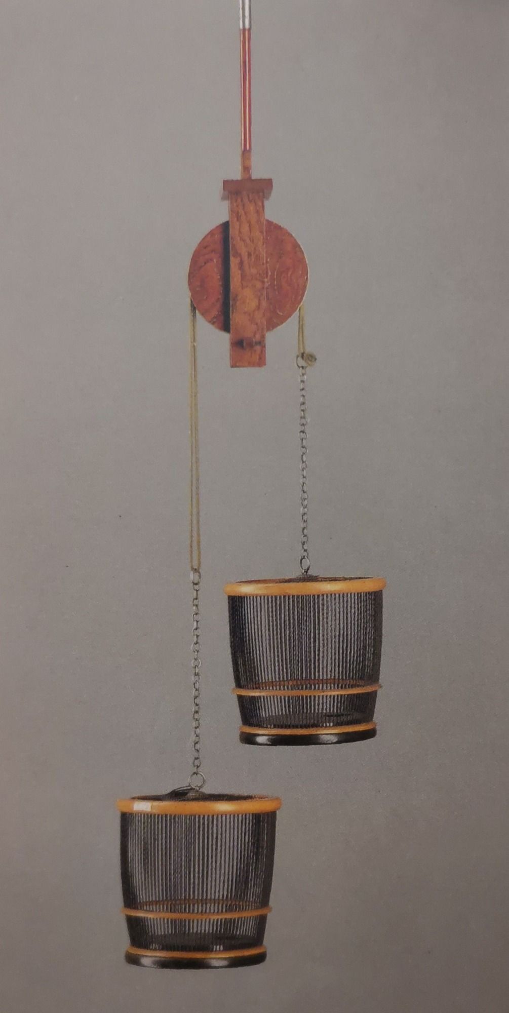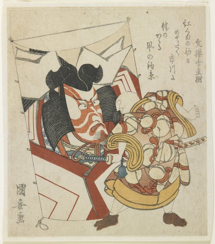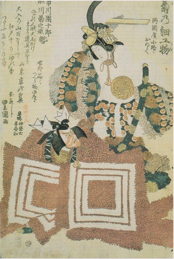 Spinning tops, spheres, wheels, umbrellas or disks, whirling apparatus, rolling balls triggering chain reactions, interconnected contraptions, ladders, balancing ropes, stacked objects, etc. Popular with the leading daidogei artists of the time, such as Hayatake Torakichi, Naniwa Matsunosuke, and depicted by the most popular Utagawa ukiyoe school artists such as Kuniyoshi, Kunisada, as well as Yoshiharu, Sadafusa, and later by Kyosai