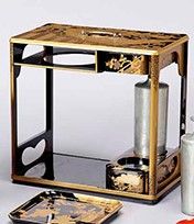 left to right: Two examples of traditional Japanese 'taka-ashi zen' or 'ai-seki zen', followed by a Wagner designed stool, an opened up Japanese picnic box. These sorts of items were often displayed at the world expositions of the 19th century. A photo by M. Moser of one of the Japanese exhibits at the Vienna Exposition of 1872 is shown last extreme right. Though the photo is rather damaged, one can clearly make out the same kind of taka-ashi zen upfront, centrally placed.