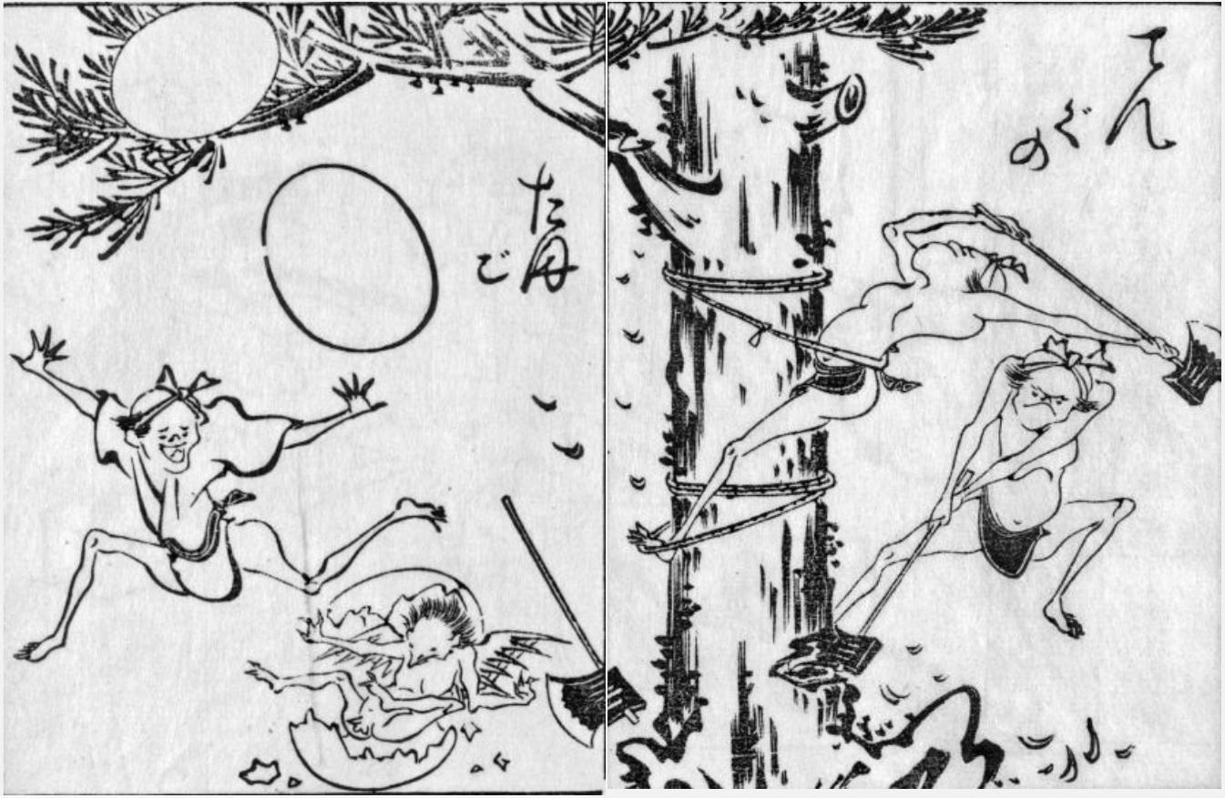 Much can be found in these images, especially in the bound collections of pictures or the light, parodying entertainment or nonsense books of Japan such as the kibyoshi, that share something in common with the illustrations and verbal humor of Edward Lear's A Book of Nonsense (1846) or Lewis Caroll's Alice in Wonderland (1865). One example might be Koikawa Harumachi (恋川春町 1744-1789)'s Kotoba-tatakai-atarashi-no-ne (辞闘戦新根 1778) which Adam Kern (2006) translates as ‘New Roots of Verbal Jousting’ but actually contains a pun that when read sounds more like ‘A New Battle of Words, eh?'