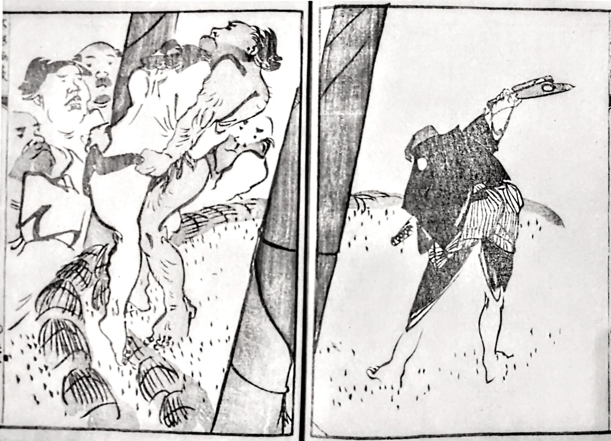 Even then, if we were to tirelessly continue to pile on to it the emaki (絵巻) picture scrolls done in the colorful yamato-e style from the 11th century onward, with fanciful or at times horrifying scenes on an epic scale, or those in the monochrome hakubyo-ga (拍描画) style depicting animal parodies and other forms of amusing black and white illustration in kappazuri (合羽摺) stencils for instance, and furthermore, if we were to remember the aforementioned bunjinga with their gentle sense of literati humor (e.g. Yosa Buson's vegetable headed characters akin to those of Granville and Philipon), that would still leave out the myriad satirical, chimerical or grotesque images adorning netsuke, inro, metalwork, lacquer and pottery wares brought over from Japan that might act as a source for comic or pathetic inspiration.